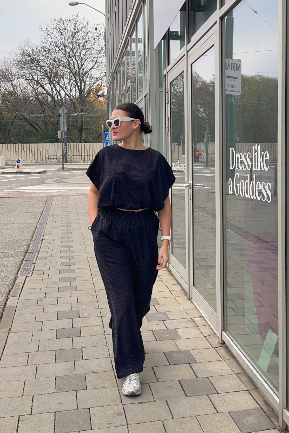 City Chic Set je kombinace pro ženu, která miluje čistotu, jednoduchost a přirozeně elegantní styl. Široké Queen Bee kalhoty ti dopřejí lehkost a volnost při každém kroku, zatímco nařasený crop top dodá outfitu ženskou energii a ležérní eleganci. Je to set pro šik minimalistku – ženu, která ví, že méně může být více.